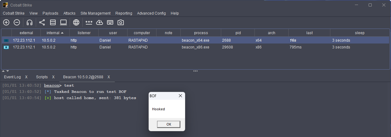 btask ( $bid, "Tasked Beacon to run test BOF" );