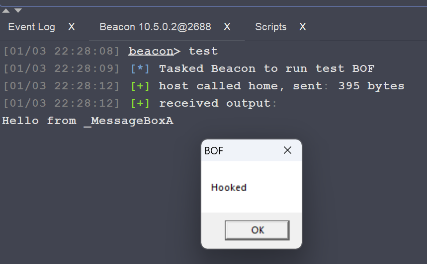 If we wanted to hook MessageBoxA, we would have another COFF that contains the hook function and the new behaviour that we want to implement: