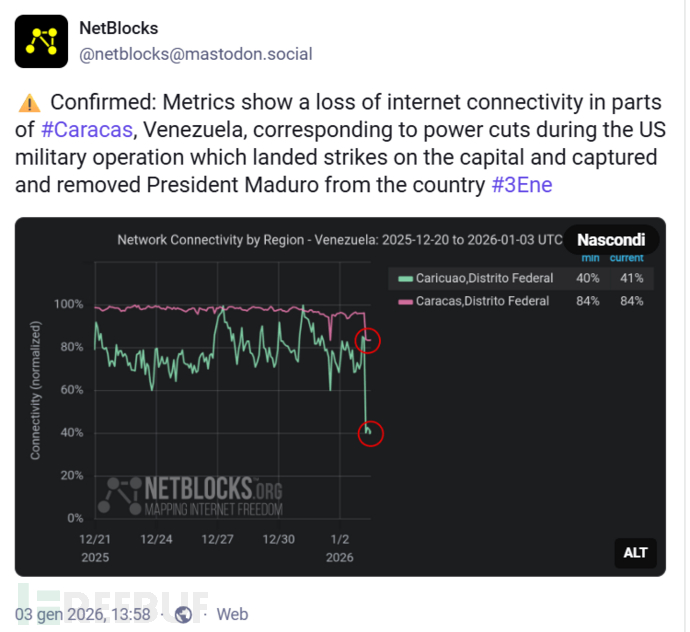 独立监测机构NetBlocks发布数据显示,在美国军事行动期间,委内瑞拉首都加拉加斯部分地区出现网络中断,这与军事行动期间的电力中断直接相关。该机构在Mastodon平台确认:"监测指标显示委内瑞拉加拉加斯部分地区网络连接中断,恰逢美国军事行动期间的停电事件——此次行动对首都实施打击并将马杜罗总统带离该国。"
