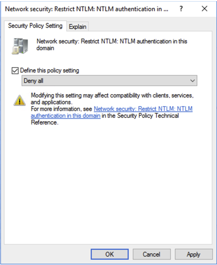 Network Security: Restrict NTLM: NTLM authentication in this domain => Deny All
