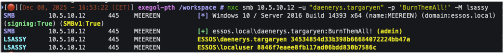 In the following example, we can see that we can authenticate with the ‘daenerys.targaryen’ account on the machine with its NTLM hash and access, for example, network shares: