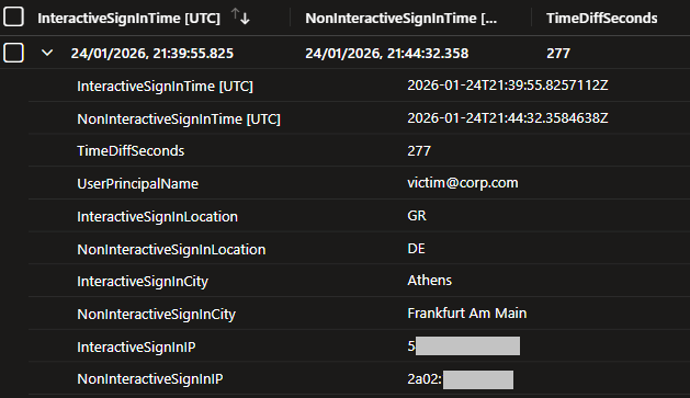 To detect this activity, we create a query that correlates successful interactive and non-interactive sign-ins sharing the same SessionId, AppId, and UserPrincipalName for the specified lookback period across the “affected_application_ids“. It then flags country, city, or IP mismatches occurring within a 10-minute window.