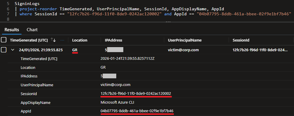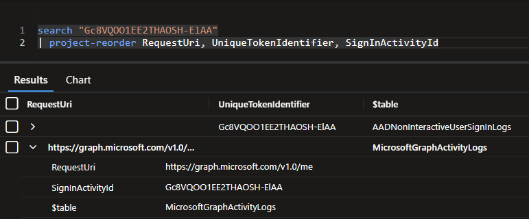 This activity is logged in the AADNonInteractiveUserSignInLogs table, and we can easily find it using the session ID and the app ID from the previous step.