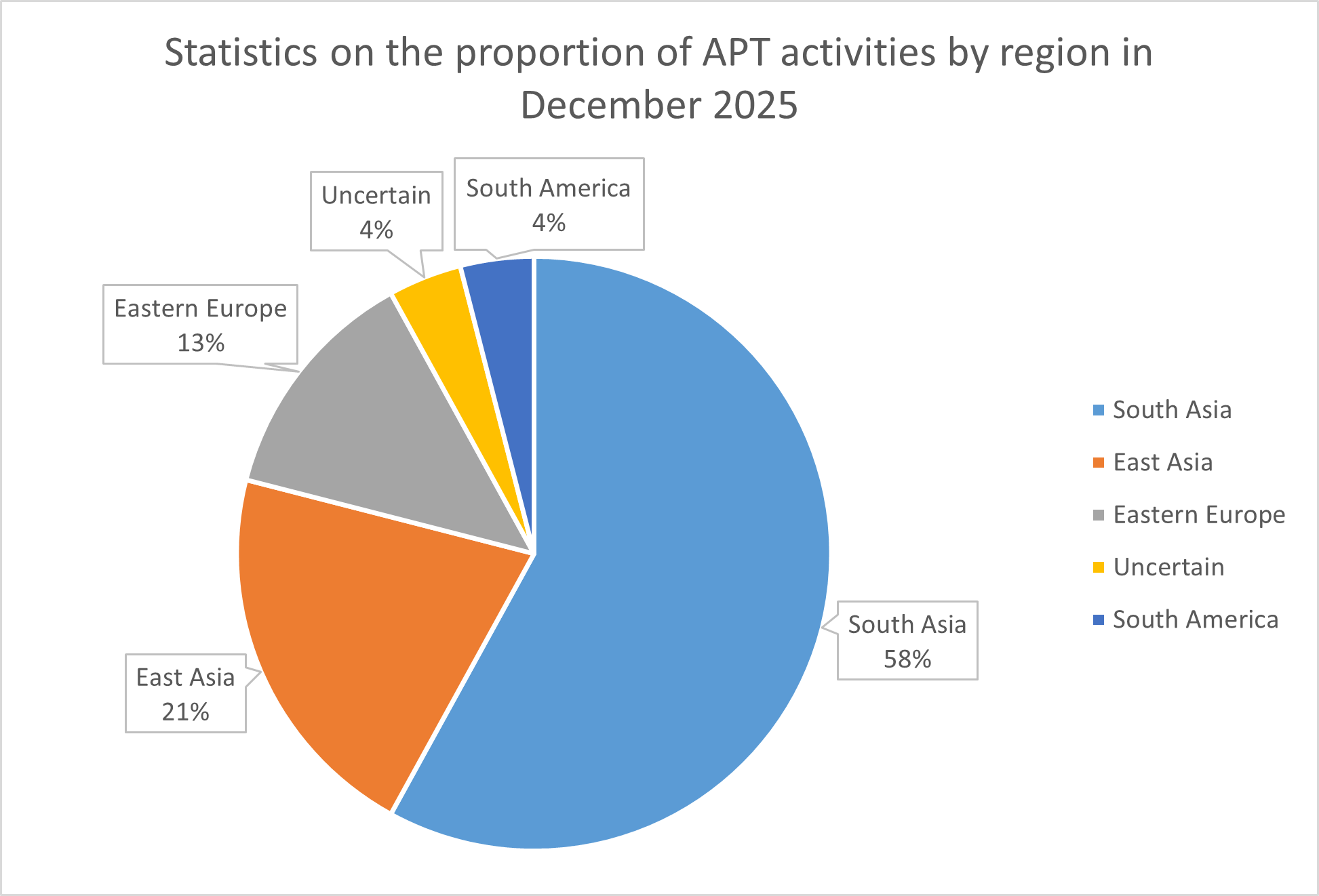 In December 2025, the global threat hunting system of Fuying Lab detected a total of 24 APT attack activities. These activities were primarily concentrated in regions including South Asia, East Asia, with a smaller portion also found in Eastern Europe and South America. Some organizations remain unattributed to known APT groups, as shown in the figure below.