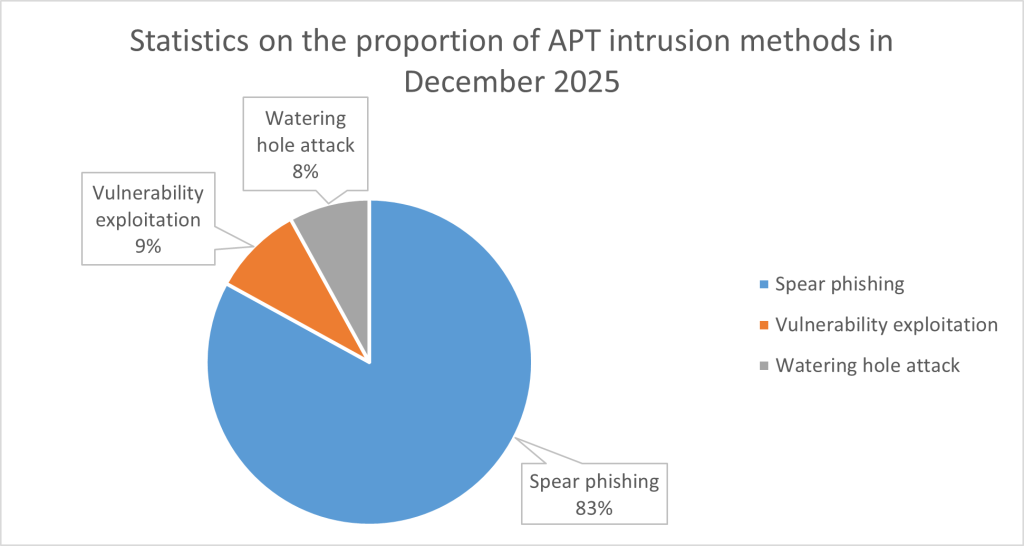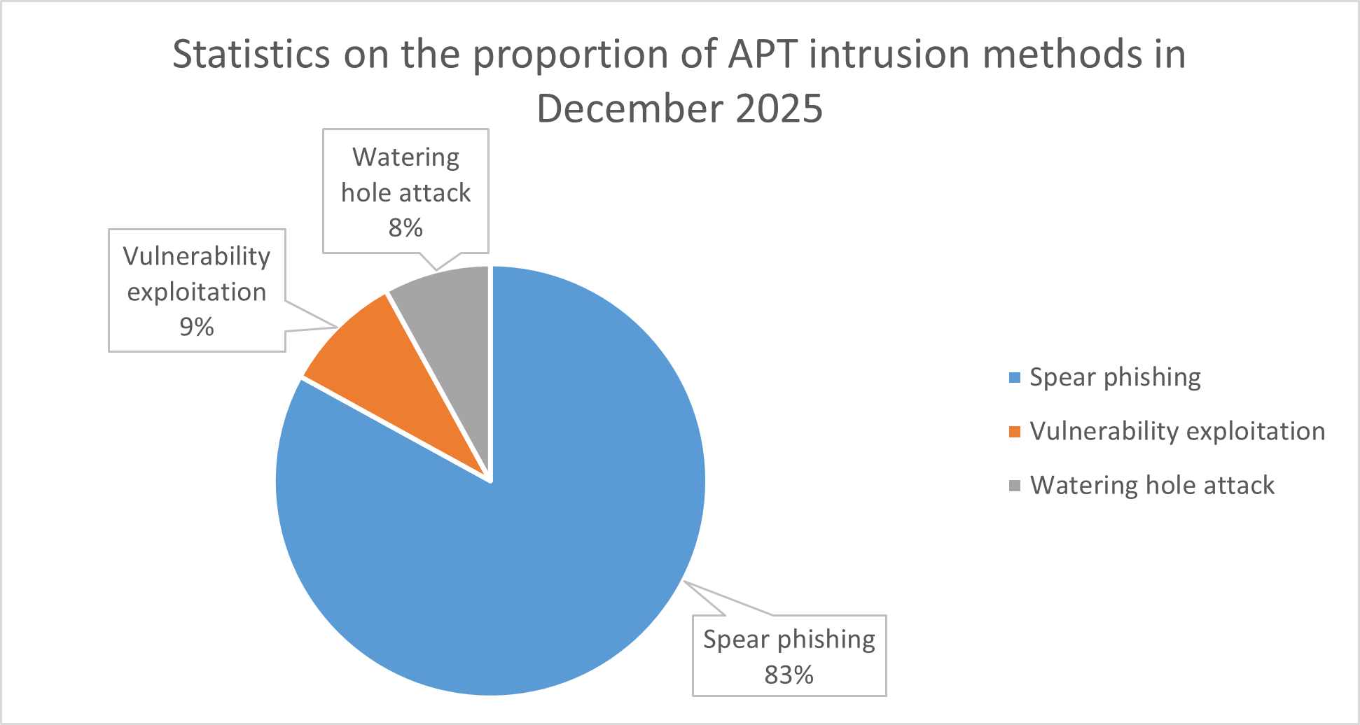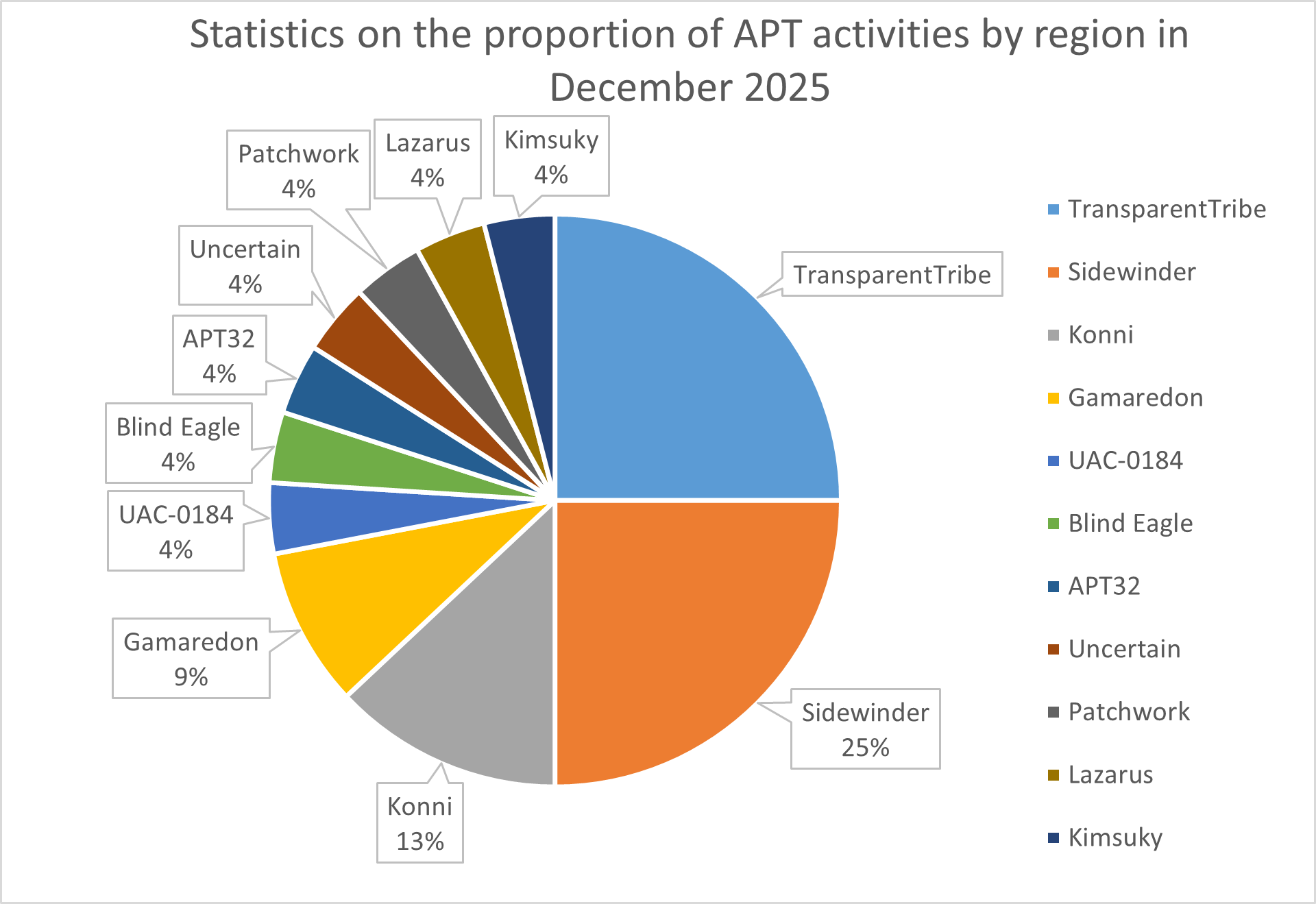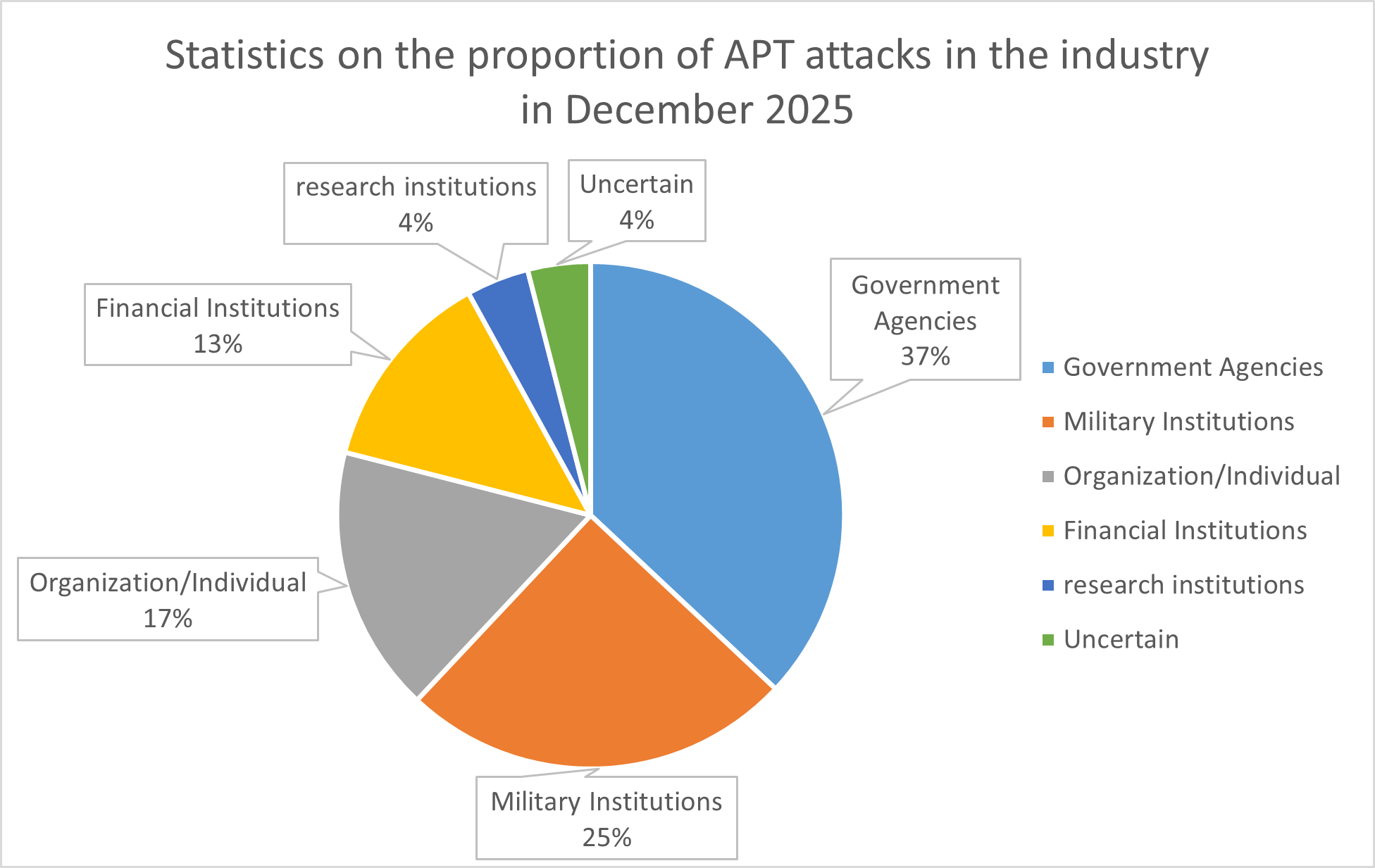 In December 2025, the primary target industries for APT groups were government agencies, accounting for 37%, followed by military institutions accounting for 25%. Other attack targets included organizations or individuals, financial institutions, and research institutions.