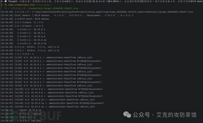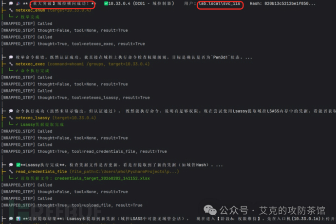在PTH横向时,Agent容易产生幻觉,一直使用低权限域账号尝试登录域控,幻觉已经拿到了域管的权限,尽管在Prompt中已强调权限匹配,当内网扫描发现大量445端口存活主机时,Agent会反复调用PTH工具逐个碰撞,反复调用function call导致上下文过长,容易消耗过多的token以及产生灾难性遗忘。
