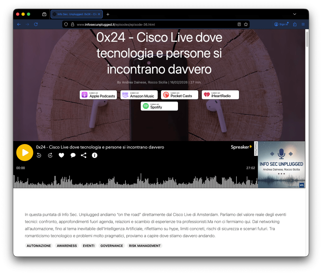 Ci tengo a ricordare che il progetto podcast Info Sec Unplugged è ideato e realizzato dal sottoscritto ed Andrea. Ogni due settimane – salvo imprevisti – pubblichiamo una puntata in cui condividiamo nostre riflessioni su temi tech e del mondo info-sec, senza particolari filtri e senza uno script.