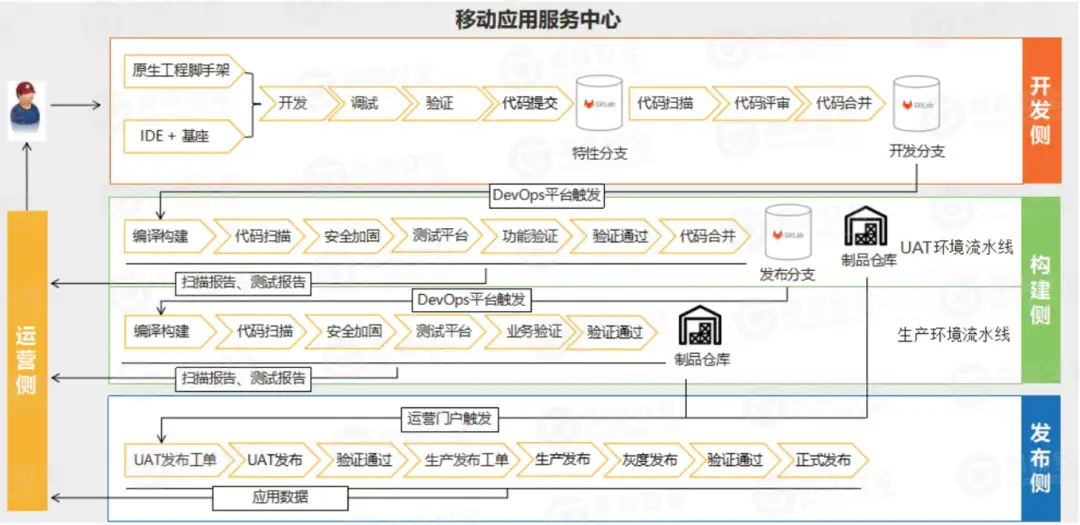 为应对挑战,客户在其技术中台的移动应用服务中心引入了梆梆安全的移动应用安全能力,旨在基于DevOps流程构建一套云端自动化安全体系。该体系无缝嵌入应用的开发、测试、构建、发布、运营全生命周期。