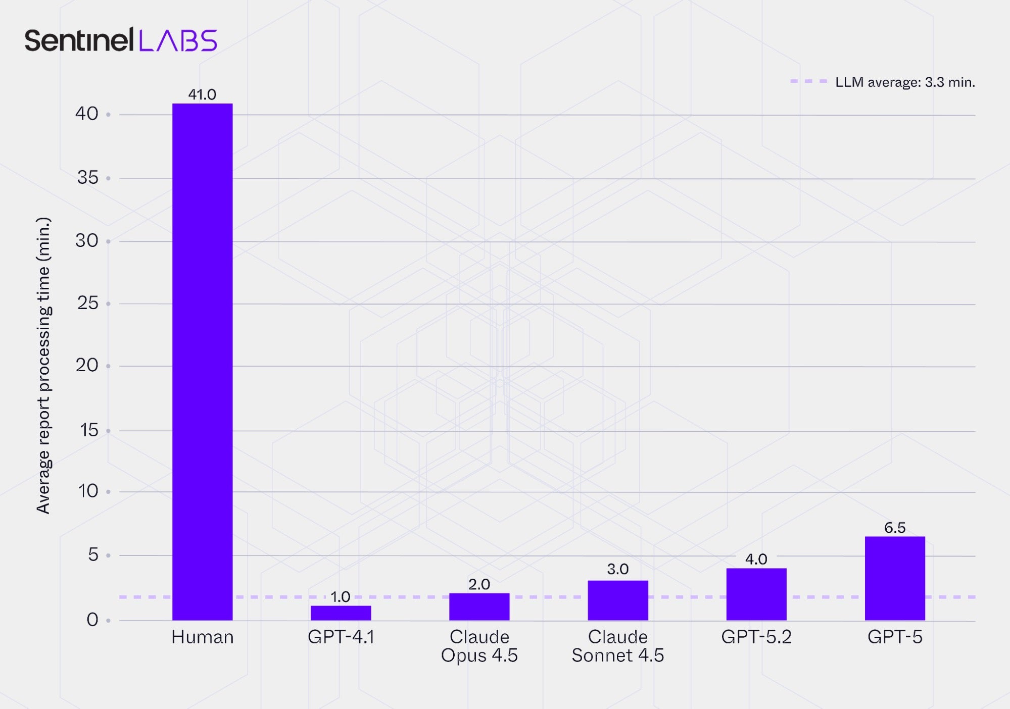 The charts below compare the average report processing times and the corresponding speed‑ups achieved by the Infrastructure and Executables Extractor configured with each evaluated LLM, alongside the baseline time required by human analysts. Report processing time refers to the end‑to‑end duration required to process a CTI report, including ingestion, reasoning, selective IOC extraction, IOC attribute value assignment, and output generation.
