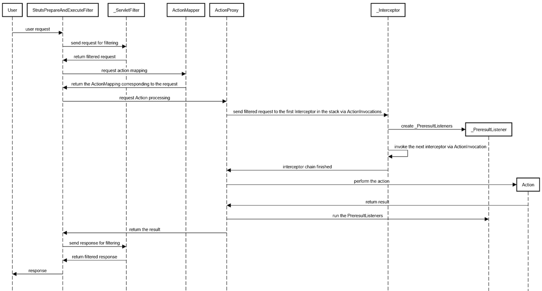When a user makes a request to Apache Struts2, the data flows through the StrutsPrepareAndExecuteFilter to all