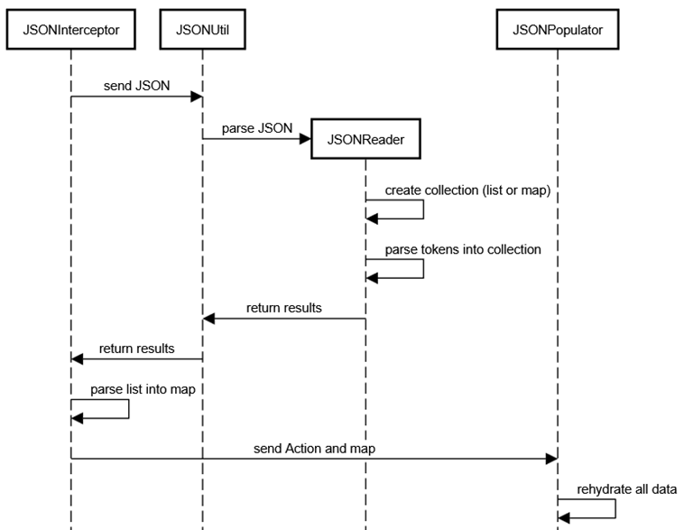 discussion are the JSONInterceptor, JSONUtil, JSONReader, and JSONPopulator. The following is a high-level diagram