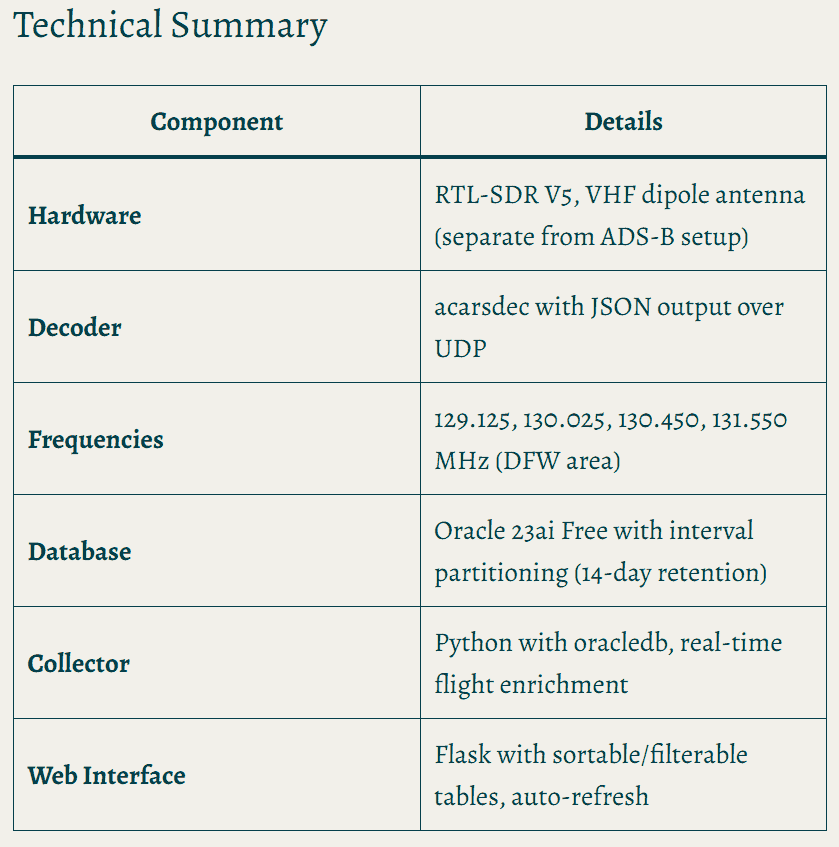 Over on his blog, cynicalGSD has written a detailed post about how he extended his home ADS-B flight tracking setup to also decode ACARS. His existing system runs an RTL-SDR dongle on a Raspberry Pi feeding a database and Flask web app. Adding ACARS required a second RTL-SDR and a separate VHF dipole antenna tuned for 129–131 MHz.