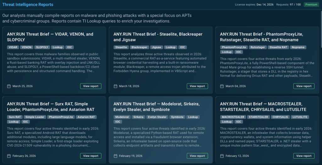 Available as part of ANY.RUN’s TI Lookup Premium plan, these reports help security teams better understand active threats and investigate them with stronger context.