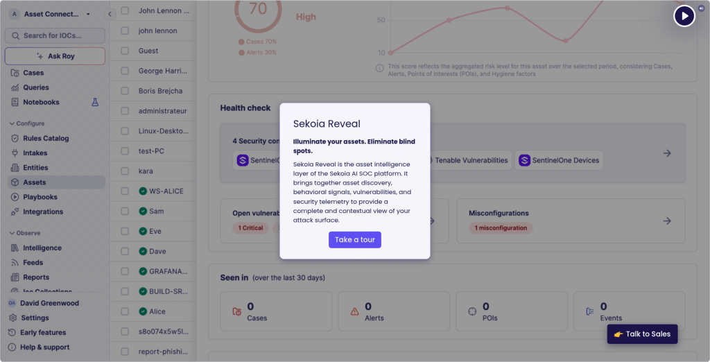 Reveal puts asset context directly into investigations, so teams can move from detection to understanding much faster. When an alert fires, analysts can immediately see the asset involved, its risk profile, its history, and related signals without losing time on manual enrichment.