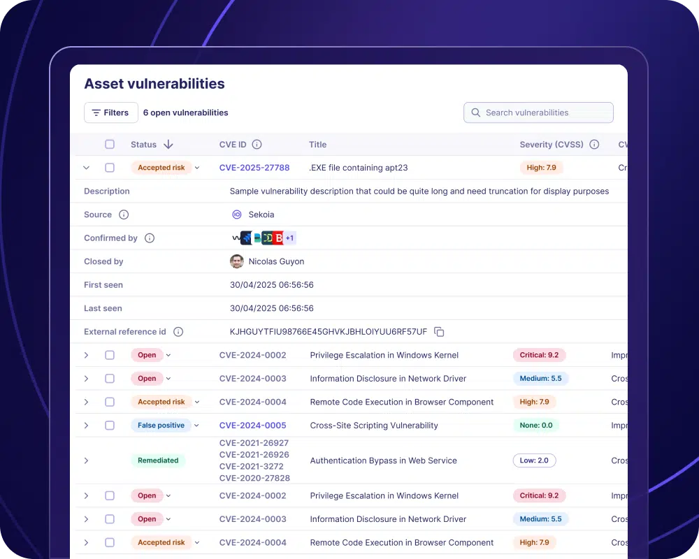 Sekoia Reveal brings asset intelligence into the SOC. It gives security teams a live, unified view of their assets, their exposures, their activity, and their security signals, so they can understand what matters faster and act sooner.