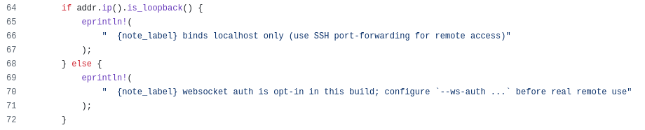 Dalla lettura del codice emerge che il sistema è consapevole dei rischi legati all’esposizione in rete. Quando l’esposizione del servizio è limitata all’interfaccia di loopback, viene suggerito l’uso di canali protetti per accessi remoti. Quando invece viene esposto su indirizzi non locali, il software segnala esplicitamente la necessità di configurare un meccanismo di autenticazione prima del suo utilizzo.