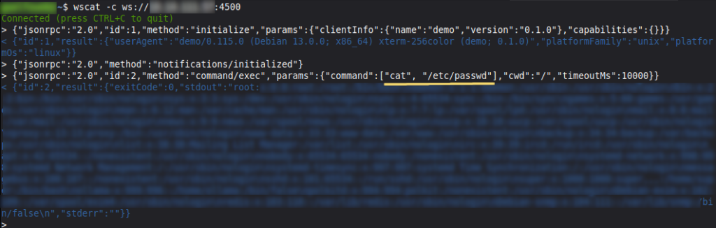 Tra le funzionalità esposte è presente anche il metodo command/exec, che consente al client di richiedere l’esecuzione di comandi sul sistema ospitante. Si tratta di una capacità documentata e intenzionale, che rende l’app-server un’interfaccia con privilegi operativi diretti sul sistema.