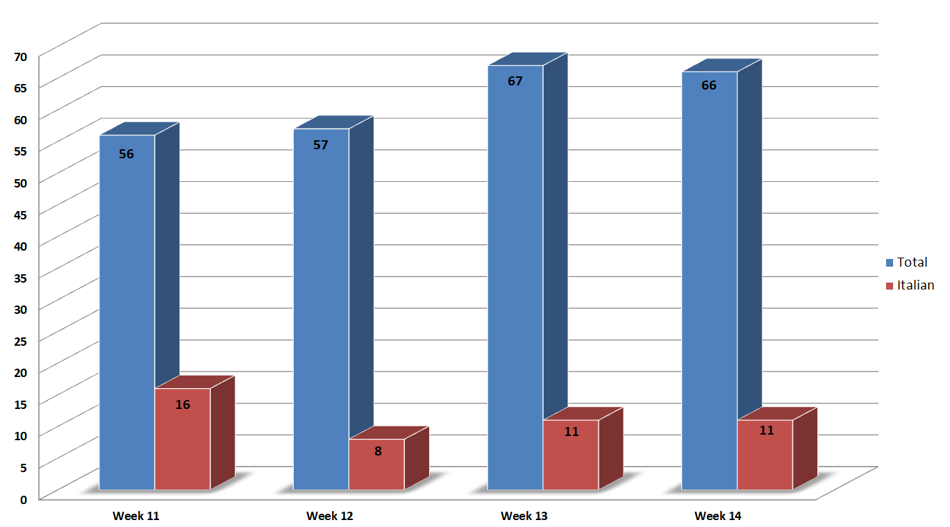 During the week under review, the number of global campaigns decreased compared with the previous week, whilst the number of campaigns in Italian remained unchanged from last week.
