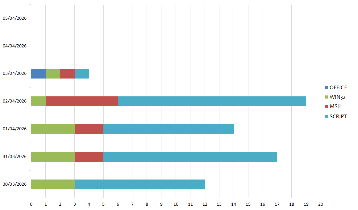 Instead in this graph we see the distribution based on malware family. In the past week 9 different families were detected: