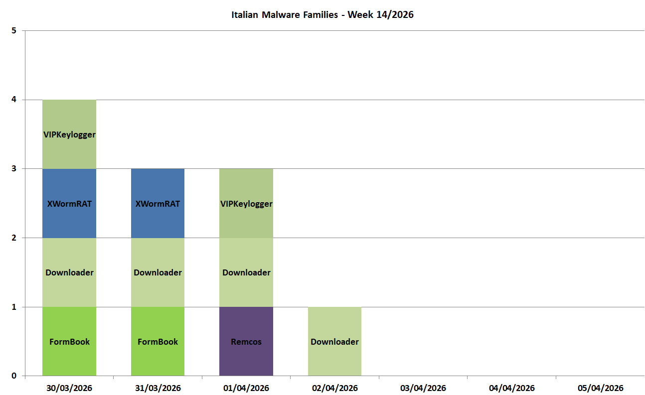In this graph we can see the malware families spread during the week with target Italy (in Italian) and composed of 5 families: