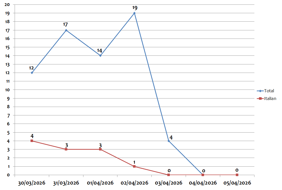 During the week, the peak in global campaigns was recorded on Thursday 02 April, with 19 different campaigns per day. The peak in campaigns in Italian was recorded on Monday 30 March, with 4 different campaigns per day, as shown in the graph below: