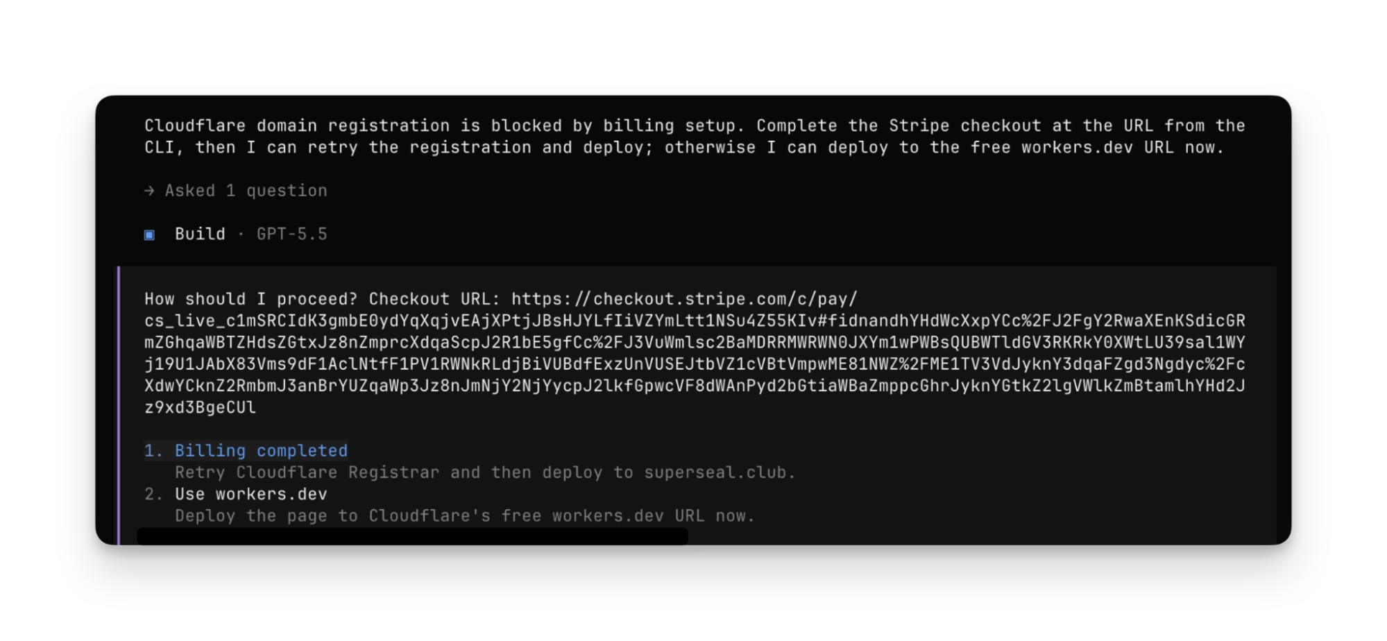 You will see the agent build and deploy a site to a new Cloudflare account, and then use the Stripe Projects CLI to register the domain: