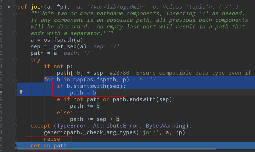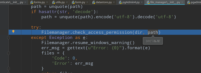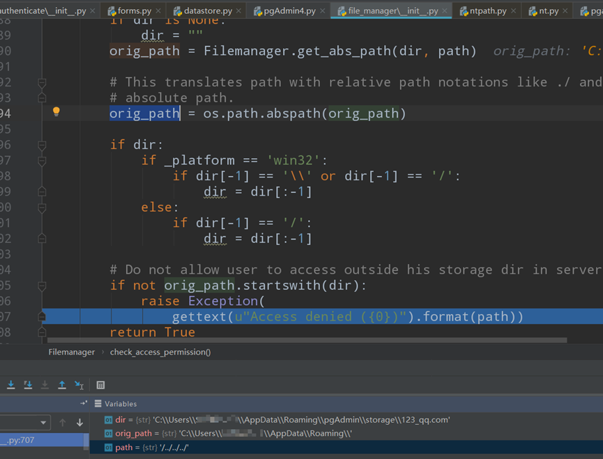 check_access_permission校验函数的内部会将path参数的值和资源目录组合并使用os.path.abspath函数获取真实路径,最终被还原的真实路径必须要包含资源路径,这样无论我们修改任何跨目录格式最终都不会和原有资源路径匹配造成异常抛出(见变量状态栏中dir和orig_path的差别)。