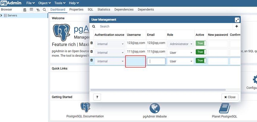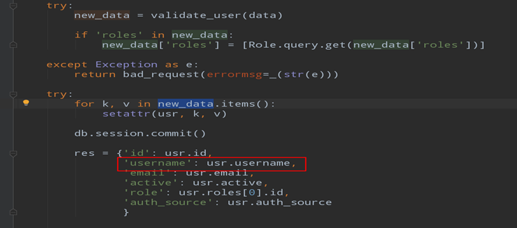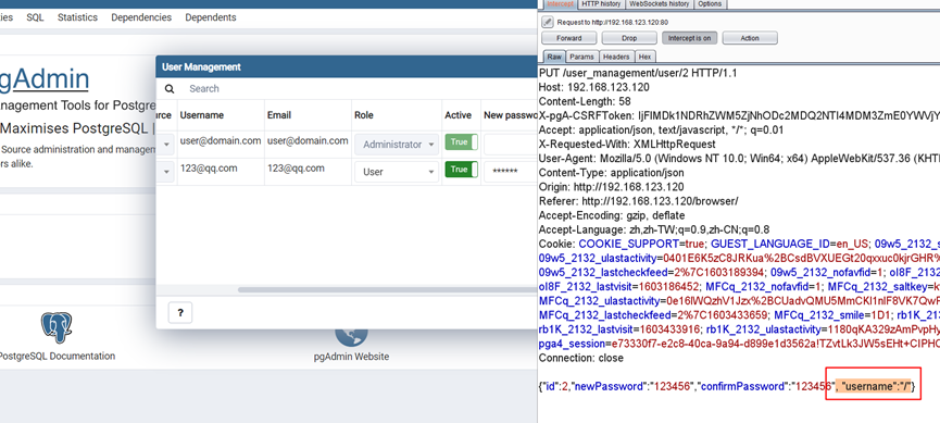 查看web/pgadmin/tools/user_management/init.py:346#update函数发现后端是通过传递表单对象的方式接收参数,后端其实会接收到我们POST发送的username参数然后提交数据库。