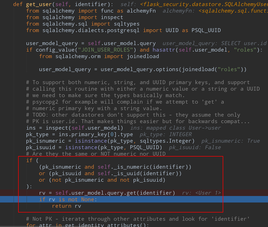我们的标识符”1”被传入get_user函数,当我们传入的email为数字或者UUID将直接使用self.user_model.query.get(1)从数据库获取用户对象并直接返回,这就造成无需匹配邮箱直接匹配数据库主建id导致无需猜解用户名进行后台暴力破解。