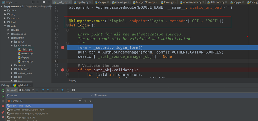 Flask项目,在登录代码函数路由处下断点。