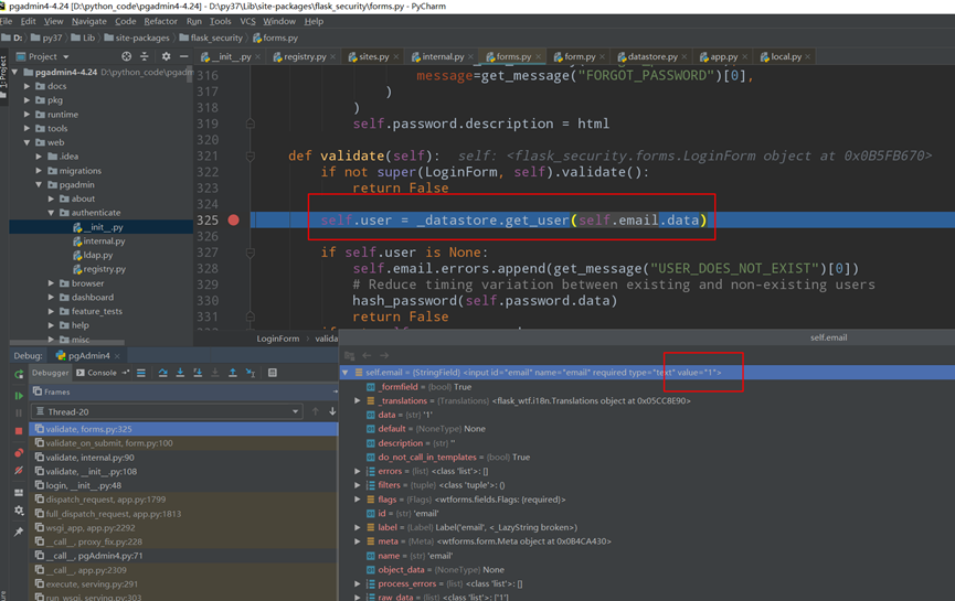 web/pgadmin/authenticate/init.py:48#auth_obj.validate() 最终调用了flask_security第三方库的forms.py中的validate(),我们可以发现self.email.data就是我们接口中输入email的值,继续跟进get_user函数。
