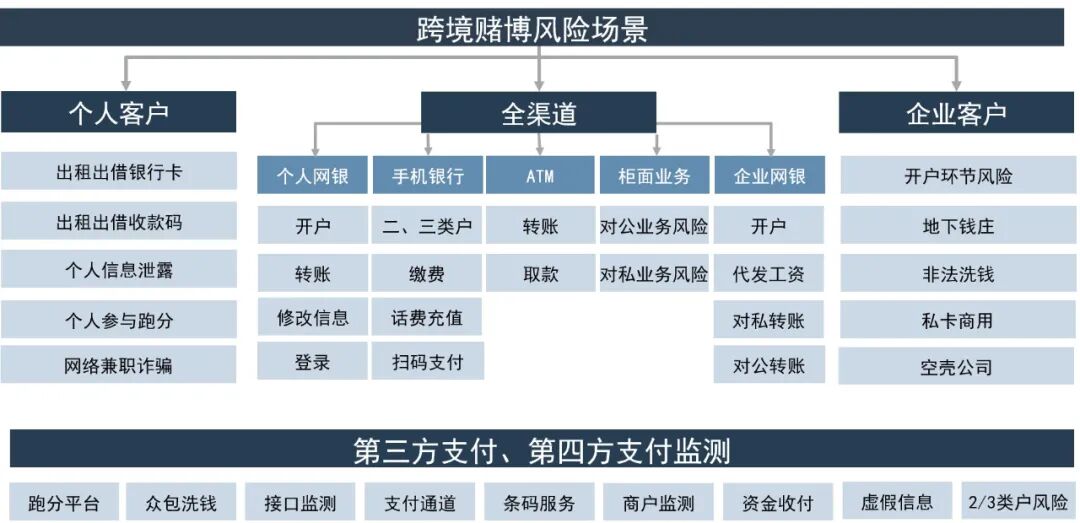 涉赌涉诈资金监测涉及众多渠道、交易环节复杂、交易层级较多;从开立账户接收诈骗资金,到转移赃款直至最终清洗完毕,其间涉及众多账户;其中监测重点是