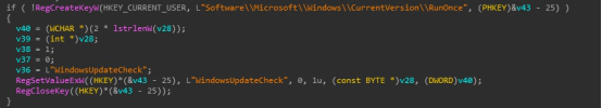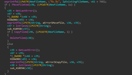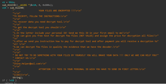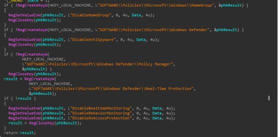 该C++程序是一个已知的GlobeImposter勒索病毒,程序功能与之前的分析基本吻合,首先对自身进程进行提权操作,然后通过修改注册表来关闭Windows Defender: