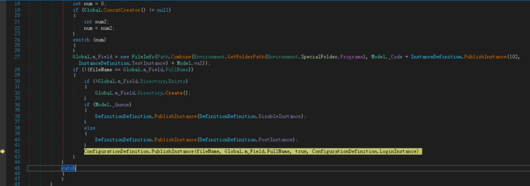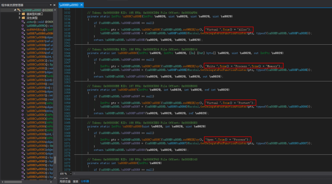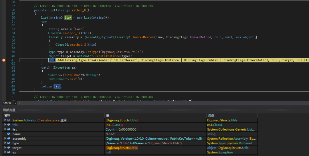 .NET程序经过混淆,动态调试时发现其使用GzipStream类解压资源段的数据,得到一个PE文件,在内存中加载该PE文件并调用Dgjxnaq.Structs.Utils的PublishWorker方法: