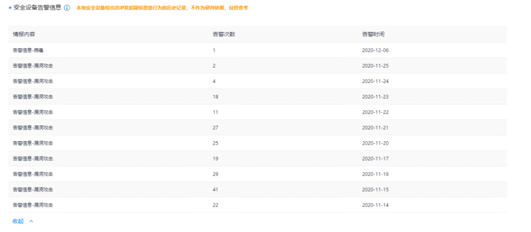 从云端安全设备告警信息中确认,该IP最初在2020年11月14日被识别为漏洞攻击使用IP,并在最近一个月内频繁进行攻击尝试;