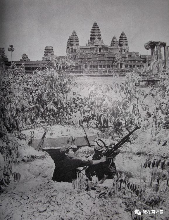 在著名古迹吴哥窟周围的柬埔寨人民武装力量的战士