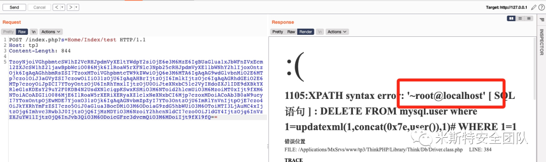 成功完成SQL注入,而且因为ThinkPHP v3.2.*默认使用的是PDO驱动来实现的数据库类,因为PDO默认是支持多语句查询的,所以这个点是可以堆叠注入的。
