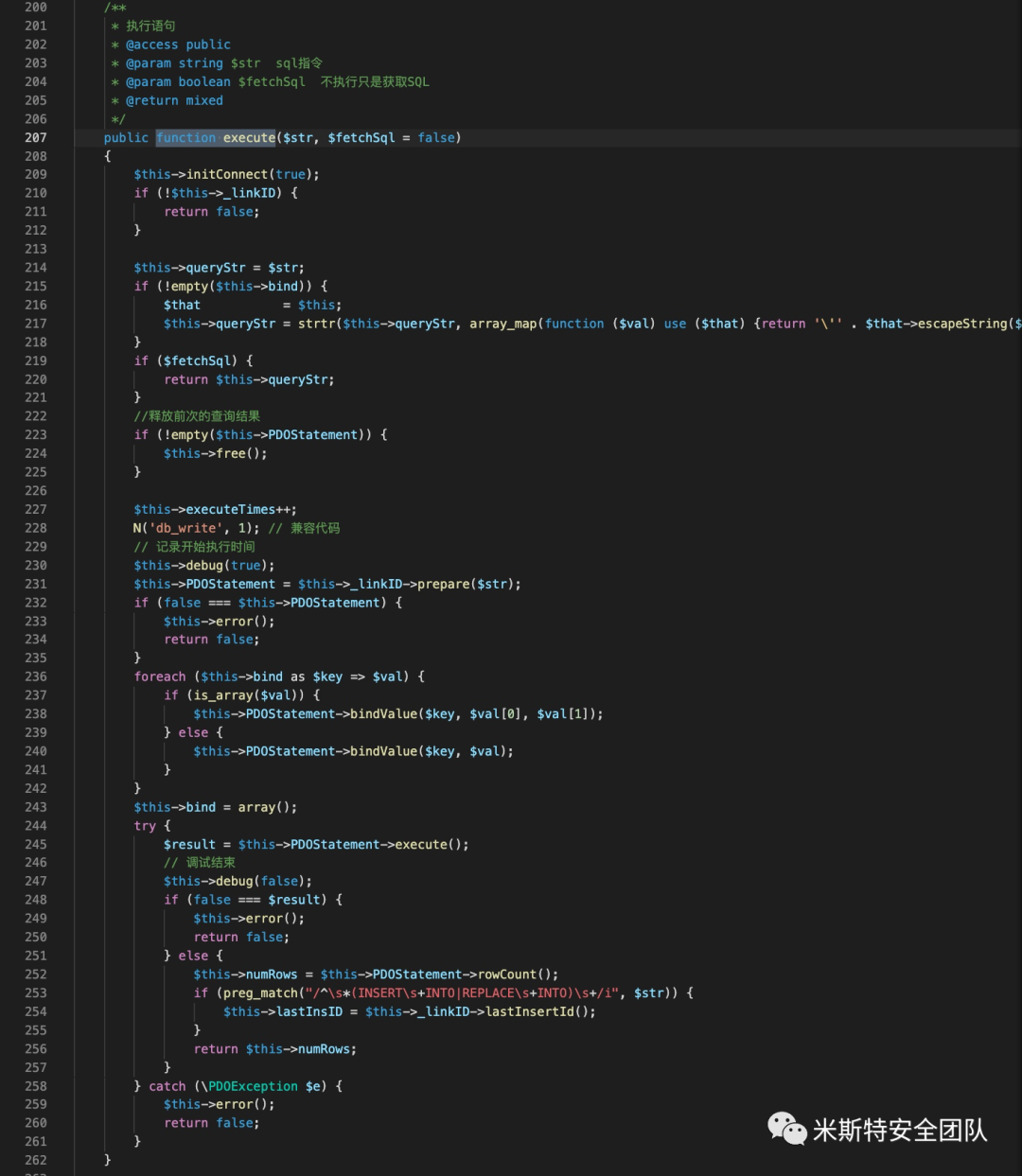 上面已经说过了,这边的参数是完全可控的,所以这里的$table是可控的,将$table拼接到$sql传入了$this->execute()。