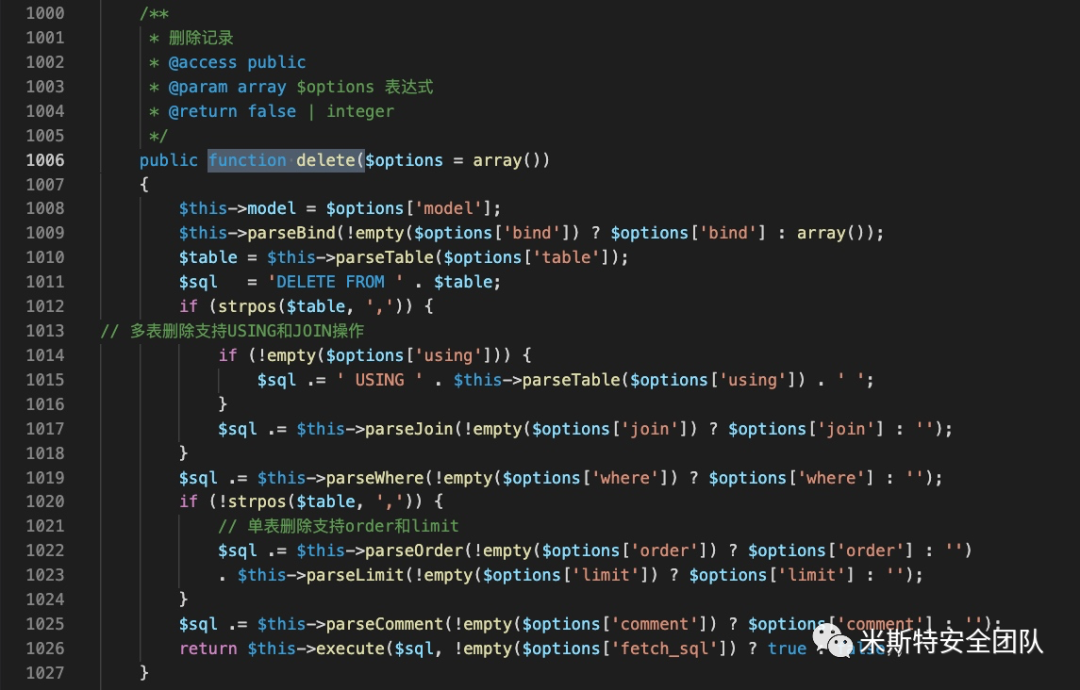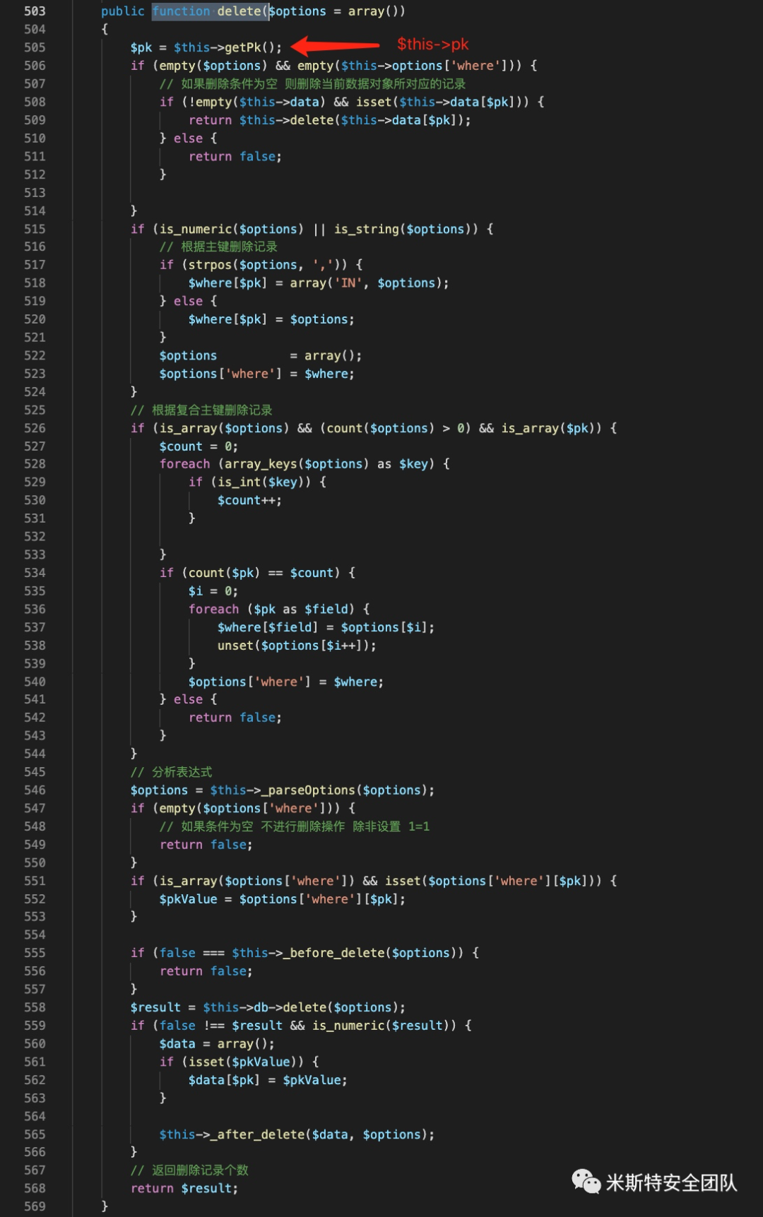这时候熟悉ThinkPHP的师傅们就应该懂了。这是ThinkPHP的数据库模型类中的delete()方法,最终会去调用到数据库驱动类中的delete()中去,也就是558行。且上面的一堆条件判断很显然都是我们可以控制的包括调用$this->db->delete($options)时的$options参数我们也可以控制。
