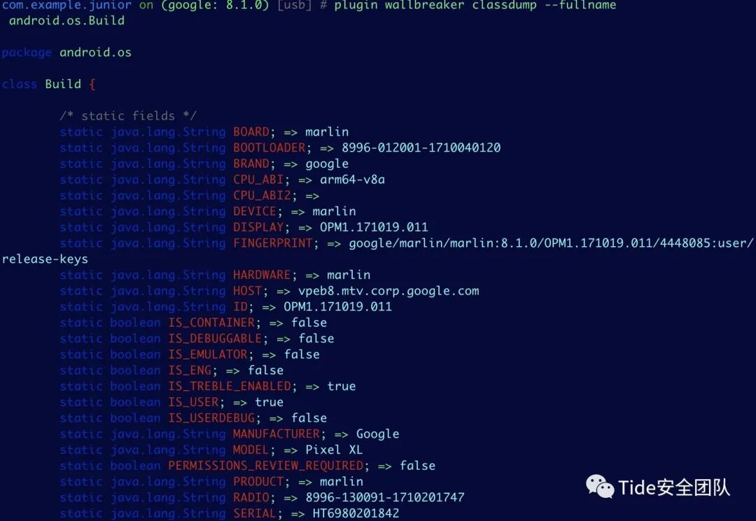 com.example.junior on (google: 8.1.0) [usb] # plugin wallbreaker classdump --fullnameandroid.os.Build