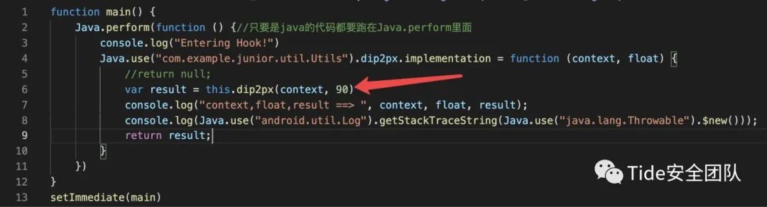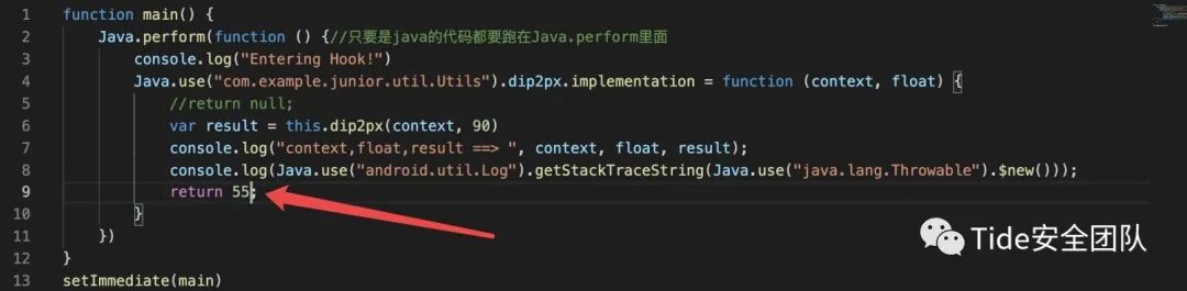 Java.use("com.example.junior.util.Utils").dip2px.implementation = function (context, float) {