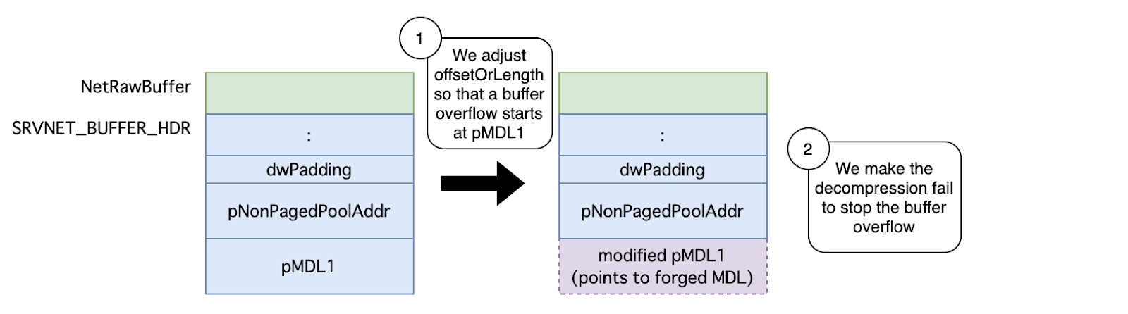 Then what should we do? The answer is to set offsetOrLength to a large value so that &newHeader->pNetRawBuffer[compressHeader.offsetOrLength] directly points to the address of pMDL1. This prevents pNonPagedPoolAddr from being overwritten, at least at the buffer overflow at (B).
